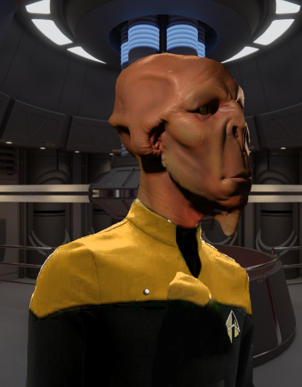 | Personal History | Nusien was born 8th of nine brothers and eleven sisters, a relatively small family by Edosian standards. Father Tobulx was a navigator aboard a dilithium freighter and was hardly seen by the family for months at a time. When he did return, it was to a great fanfare and family celebration organized by his bond-partner Bidaln. Young Nusien remembers being puzzled by his father’s withdrawn nature and wondered why he took himself out of the family gatherings to be alone when he had spent so long away from them. Mother Bidaln was a gregarious and generous career of the family, the grandchildren, the nephews and various relations in and out of the homestead. She focused on the farm, ensuring her children received a good education and learned the value of hard work. She was a stern and often dismissive parent, usually demanding the children sort out their own squabbles rather than waste her time with petty disputes. When it came to what she deemed real issues though, Mom was a rock that any of her family could anchor to. Nusien spent a very typical Edosian childhood, climbing trees, surfing ion storms and generally enjoying the outdoor life. His closest friend was Piret, hatched the same day as Nusien and lived in the same hex-zone. She would call on him on the way to school and they would roam together in their free time, often egging each other into greater deeds and daring exploits. If Nusien was in trouble, it was often because he was covering for Piret and vice-versa. When Nusien won a place at the Edo Engineering Annex, Piret was applying for Starfleet Academy and the two parted ways, dismayed but promising to stay in touch. After graduating from the Edo Engineering Annex where Nusien specialized in plasma distribution and advanced molecular fabrication theory, he signed on with a merchant ship, Captained by an acquaintance of his father. he served aboard for nearly ten years until at the age of twenty-seven when the Freighter Captain, a Tellerite by the name of Gisolv, found Nusien apparently dead in his quarters. Nusien was returned to Edo and solemnly handed over to Bidaln who happily removed the shroud and placed Tivel in his old bedroom. Some days later, to yet another celebratory family get-together, Tivel Nusien emerged from a natural coma and sloughed off his first skin on his first “Day of Rebirth”. Ma Bidaln admonished him for being “fashionably late” as most Edosians experience their first Rebirth by 25. Aboard the freighter, Nusien experienced firsthand the horror and violence of the Dominion War, their freighter being the target of first Klingon inspection, ostensibly “searching for Changelings” and later running the gauntlet of Dominion/Cardassian expansion. More than once Nusien came up with inventive solutions to conceal the freighter, or evade Jem’Hadar patrols.. He became somewhat obsessed with protecting the freighter, putting in continual requests to improve defensive and offensive capability. Gisolv refused most requests on the basis of costs, but allowed Nusien as First Mate to revise the crew rota and improve emergency drills. On his return to Edo, his family noticed he was a changed man. Still chatty and sociable, but his eyes were always checking the room and his talk was always full of admonitions to be careful and alert. The only time, they noticed Nusien relax was in the presence of Piret. She returned to Edo during Nusien’s leave, on leave herself after losing her ship to the Dominion at Deep Space 9. Together they shared an understanding of the dangers and threat to the Federation that few other Edosians comprehended. They were married that summer and their first hatchlings were born the next spring. Piret felt she had seen enough combat, but Nusien could not leave things in the state they were in. He promised to protect Piret and their brood and signed up for Starfleet. He seemed intent on putting a shield of duranium around the Federation and nothing Piret could say would convince him otherwise. Starfleet life was hard for Nusien, the training grounds and unrelenting drills, exercise and assessments were, to an Edosian, highly biped-biased. Every vehicle he operated, every uniform he needed to adapt, just reminded him how rare the Edosian physiognomy is in the galaxy. Every time he fumbled something, or tripped on something it made him more determined to push through it. Though he was last in almost every physical exercise he developed a tendency to talk and chatter to keep his fellow cadets on side and keep good humour in even the most demanding of scenarios. Nusien was surprised when his career took him through the Combat Engineer role, but it seemed a good fit for his skills. He had expected to become somewhat heavy-handed, to lay down appropriate use of force and remind the galaxy of the might the combined forces of the Federation could bring to bear. Instead he found himself assigned to the aftermath of the Dominion War, assisting the provisional democratic Cardassian government in the repair and rebuilding of colony worlds affected by the war. The Edosian found that here, where the locals were distrustful of anyone with a phaser in hand, that he quickly had to develop new skills. You can’t set off a tri-cobalt explosive any old how in a colonist’s backyard, so he had to learn how to talk them down, assure them of their good intentions and demonstrate that by quickly re-establishing the necessities like power and water. Still it didn’t always work out. More than once he and his team were pinned down behind a newly constructed corn silo or aquifer, trying to work out whether it was a True Way battalion or just a group of over enthusiastic youngsters with ancient phasers, defending their homes. Piret noticed the changes, the need to joke and deflect true feelings when she talked to him on subspace comms. On leave he would throw himself into family life, playing, helping with homework and the like, but his stor